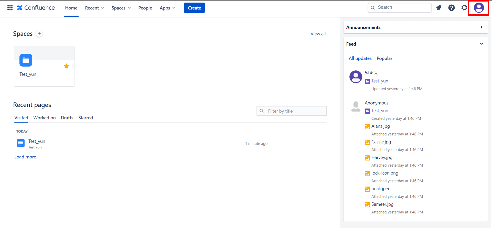 컨플루언스 홈 또는 공간 아이콘을 클릭하면은 한국어로 바뀔 거예요.