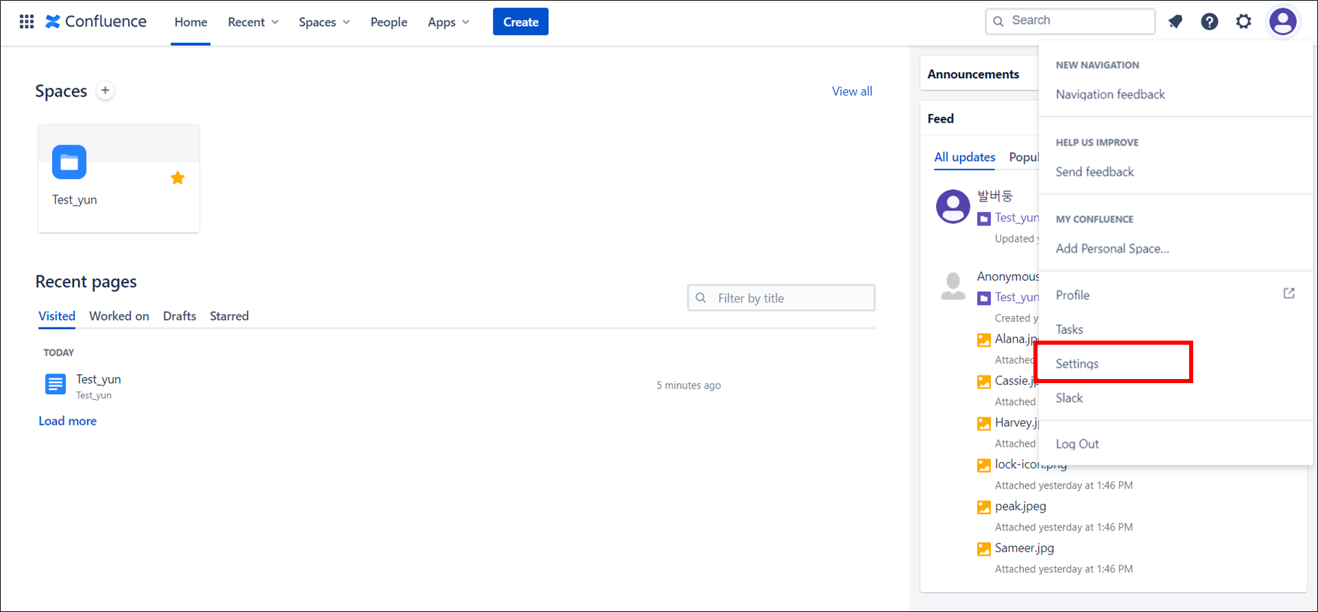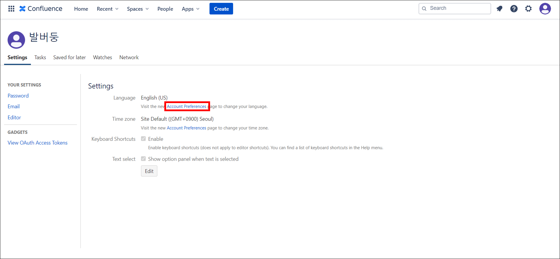 컨플루언스(Confluence)를 가입하고 나면 초기 기본 언어 설정이 영어로 되어있을 거예요.