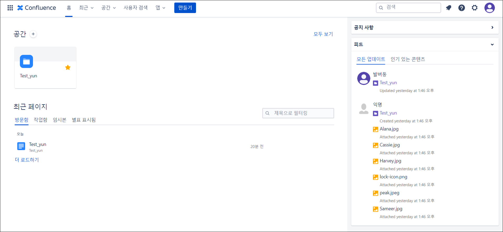 그리고 좌측 상단의 Confluence를 클릭하시면 초기화면으로 돌아간답니다.